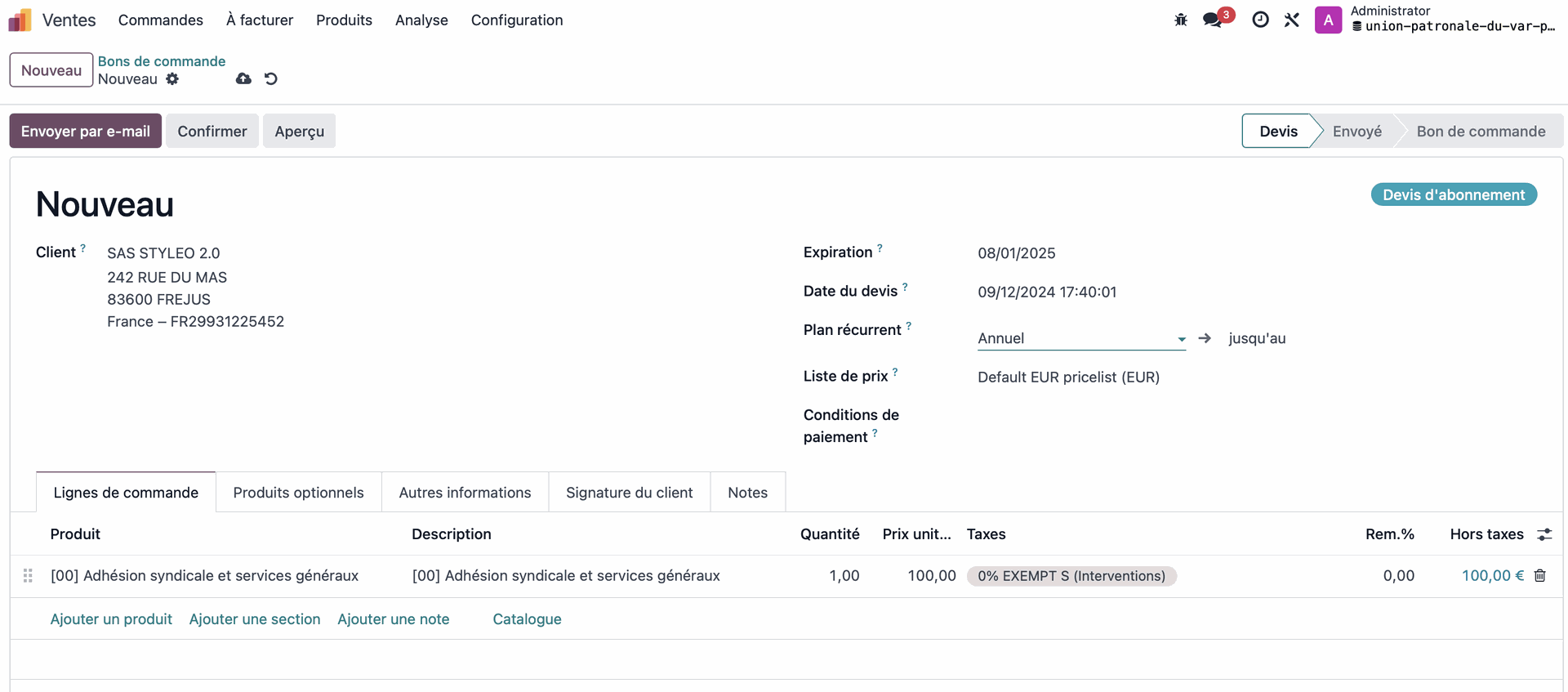 Le produit d'abonnement est un produit dont la vocation est d'être inclus dans un abonnement. Au moins un produit de type abonnement est nécessaire dans un devis avec un plan récurrent.