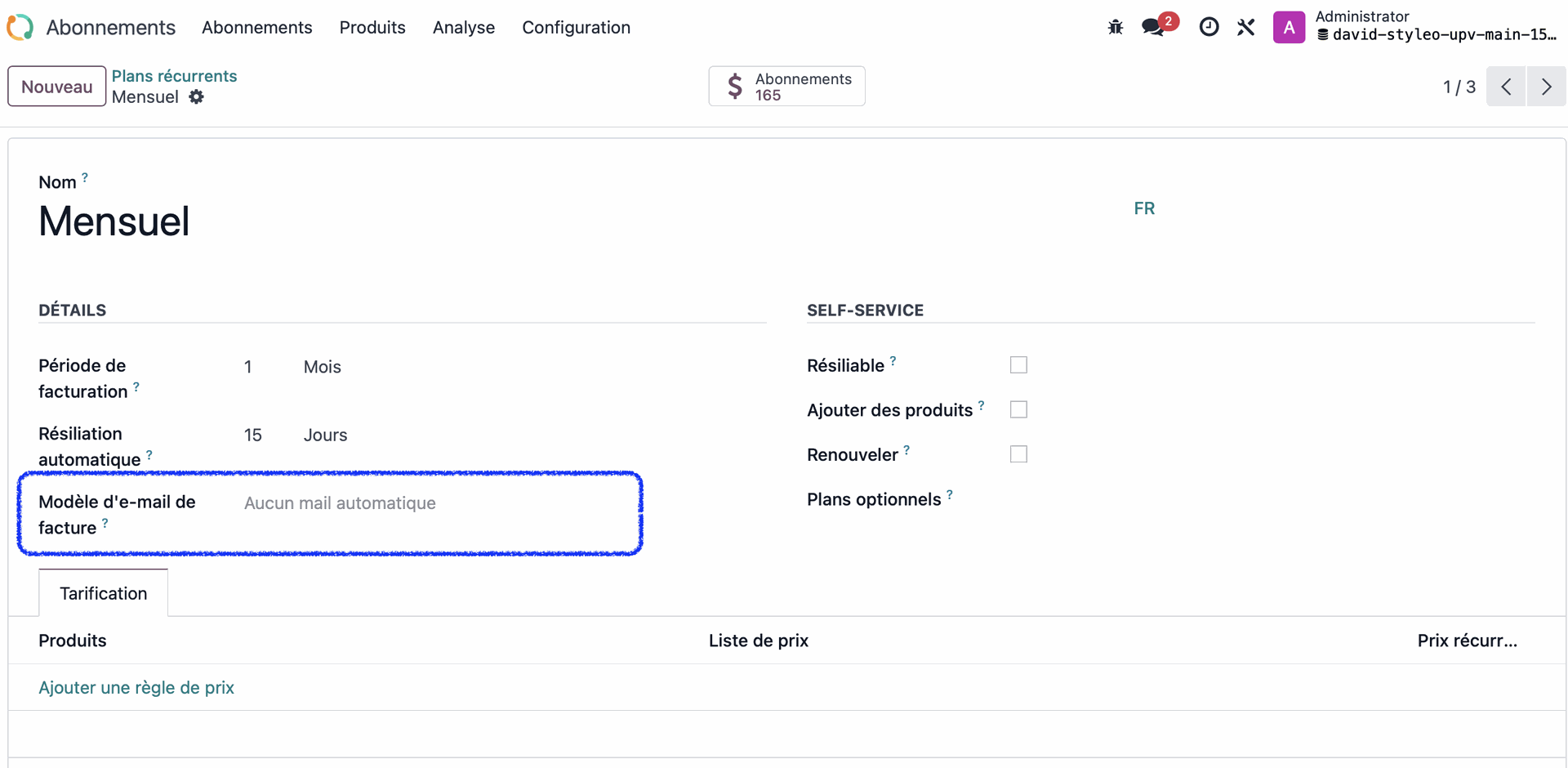 Création plan récurrent d'abonnement (mensuel, trimestriel, annuel ....) : Abonnements / Configuration / Plans récurrents. Attention aux délais de résiliation automatique car les abonnements seront automatiquement annulés. Il est également possible de définir des listes de prix rattachées aux plans d'abonnement, une liste de prix permettant pour un même produit d'avoir une tarification différente fonction de certains critères. La partie self-service concerne les fonctionnalités offertes au client via le portail client.